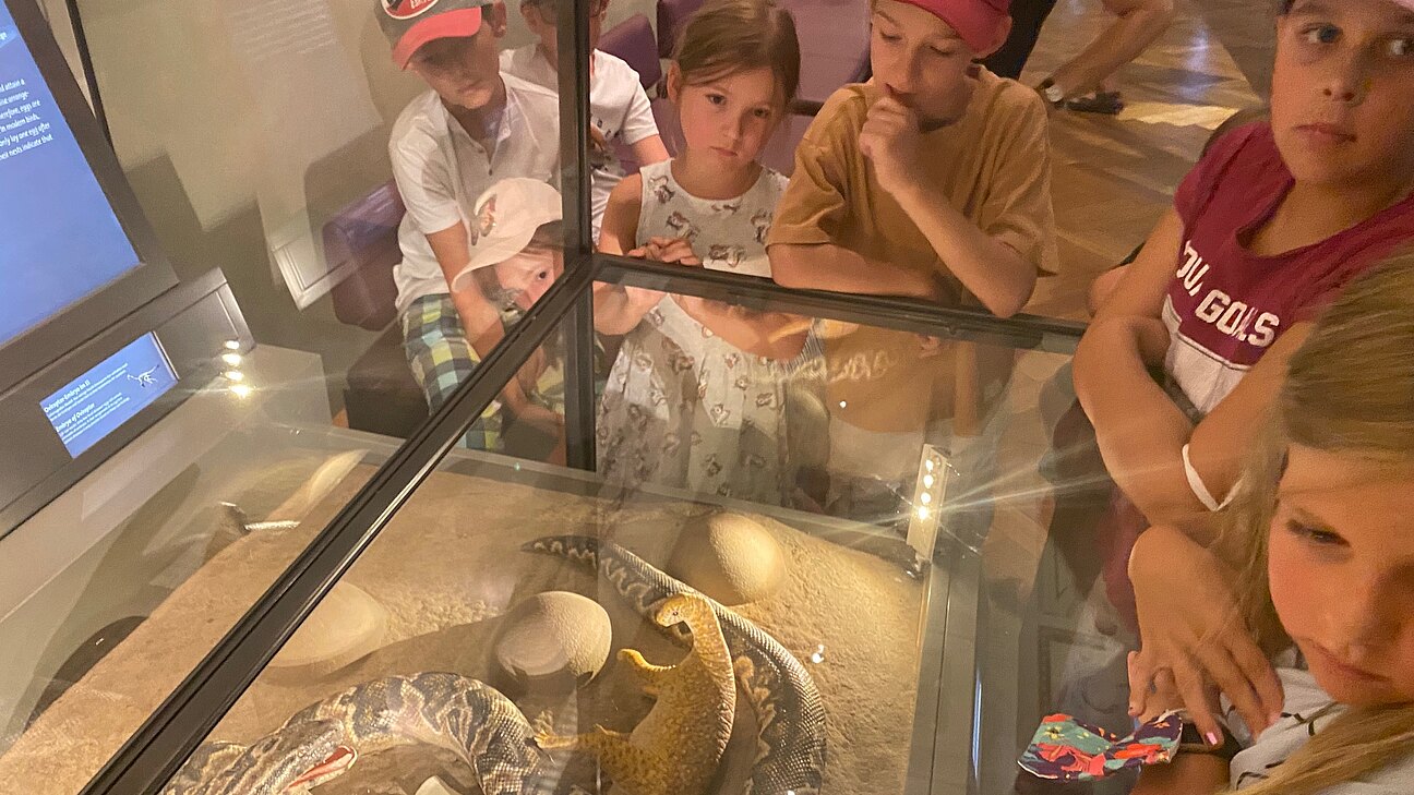 Es gab Skelettfunde, fossile Eier, Exkremente, Palmen und Fußspuren von Sauriern zu bestaunen und sogar ein echter versteinerter Saurierknochen konnte betastet werden.